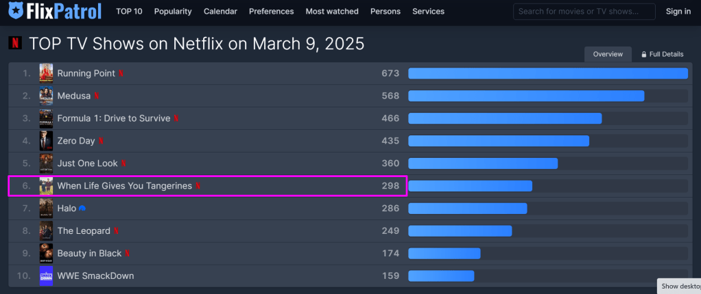 Released on March 7, 2025, When Life Gives You Tangerines has achieved significant success, ranking sixth globally on Netflix as of March 9, 2025.flixpatrol.com